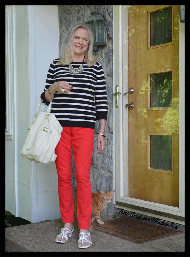 My top is a 100 % cotton black and white stripped knit by Liz Claiborne. This top has been a staple in my spring/summer wardrobe for at least eight years. I have worn it with everything from blue jeans, black pants, white capris, and now bright red jeans.