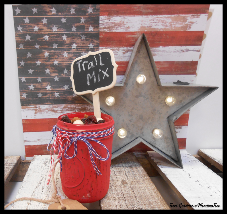 The first project was painting a jelly jar with milk paint and then distressing it with sand paper. Then decorating it with yarn, cording or jute. You don’t see my lid in this photo, but it has one and is sitting on my kitchen counter, empty, of course. Sprouts has good granola but I have my own granola recipe that I’ve been making for years so I will fill them next time with my own concoction.