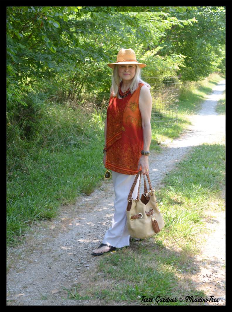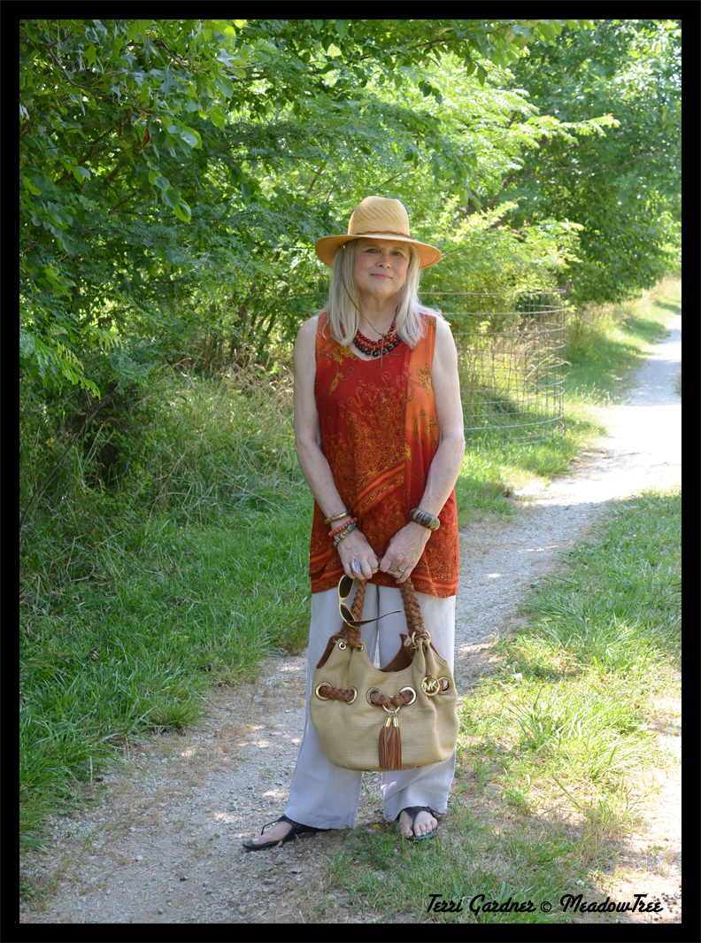 My loose linen trousers have a tie waist which makes them easy wearing. They are by Carol Little and have been in my closet since the early 2000s. The Indian print top is rayon but it has always been cool, probably because of it being sleeveless. I picked this up at a thrift shop in Florida and used to think that only Florida had the good thrift shops. When I would visit my sister, I would take an extra collapsible suitcase with me! But now that I have found some wonderful stores in Missouri, my sister Donna and I will have more free time. She won’t have to take me to every thrift in the three county area (but you know thrifting, we will have to visit some)!
