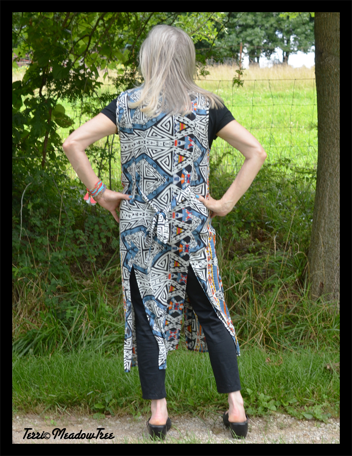 I don’t see the digital quality of this piece as compared to digital prints that see at Mood Fabrics (click here to see what I mean). However, I love this print and don’t think I will tire of it. The vest is nice and long, has inset pockets, two back vents and has ties in the back. For now, I just leave them tied in a bow (there’s a back view below).
